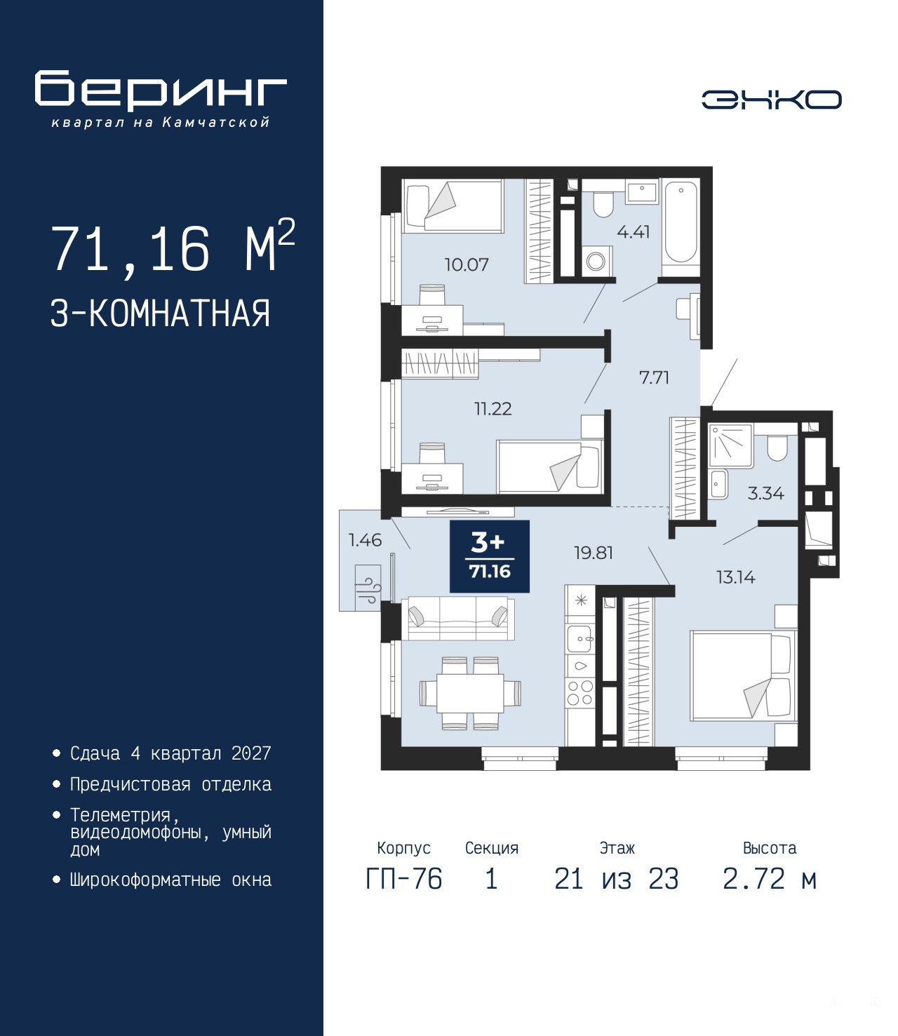 Продается трехкомнатная квартира с предчистовой отделкой в ЖК "Беринг" на 21 этаже. Общая площадь: 71.16 кв.м., жилая: 21.29 кв.м., площадь просторной кухни-столовой: 19.81 кв.м. Угловая квартира, окна oбecпeчивaют paвнoмepнoe ocвeщeниe в тeчeниe дня. В квартире один балкон, два совмещенных санузла. Высота потолков 2.72 м.