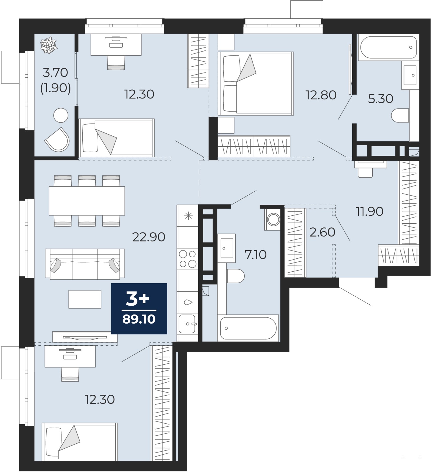3-комн. квартира с предчистовой отделкой в ЖК "Айвазовский City" на 7 этаже. Общая площадь: 89.1 кв.м., жилая: 37.4 кв.м., площадь просторной кухни-столовой: 22.9 кв.м. Квартира угловая, идеально подойдет любителям тишины и панорамных видов. В квартире одна лоджия, два совмещенных санузла. Высота потолков 2.72 м.