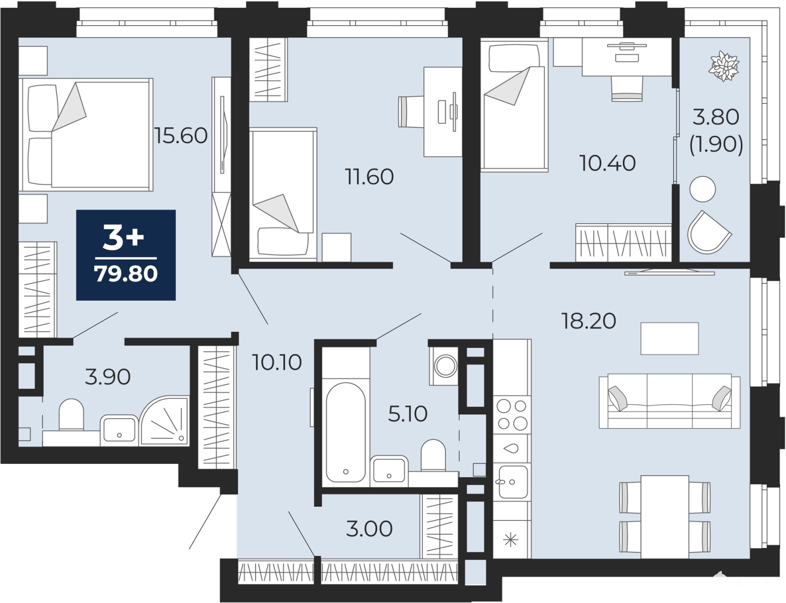 Просторная 3-комн. квартира с предчистовой отделкой в ЖК "Айвазовский City" на 16 этаже. Общая площадь: 79.8 кв.м., жилая: 37.6 кв.м., площадь просторной кухни-столовой: 18.2 кв.м. Угловая квартира, идеально подойдет любителям тишины и панорамных видов. В квартире одна лоджия, два совмещенных санузла. Высота потолков 2.72 м.