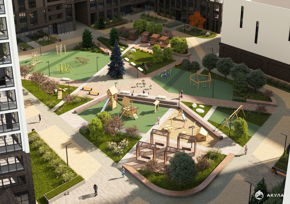 Организовано по принципу безбарьерной среды, свободной от машин. Все площадки для шумных командных игр также вынесены за пределы двора. Игровые зоны спланированы так, чтобы удобно было и детям, и родителям. Качели, песочницы и разнообразные спортивные зоны хорошо просматриваются, но расположены на достаточном расстоянии, и юные жители в разгар игр не помешают взрослым. В центре двора в первом квартале мы обустроим мини-площадь с живой елью.