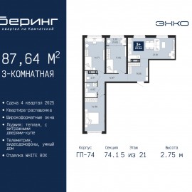 Просторная 3-комн. квартира в ЖК "Беринг" на 5 этаже. Квартира без отделки, новый собственник может сделать ремонт по индивидуальному дизайн-проекту. Общая площадь: 87.64 кв.м., жилая: 41.62 кв.м., площадь просторной кухни-столовой: 21.91 кв.м. Квартира - распашонка, без проходных...