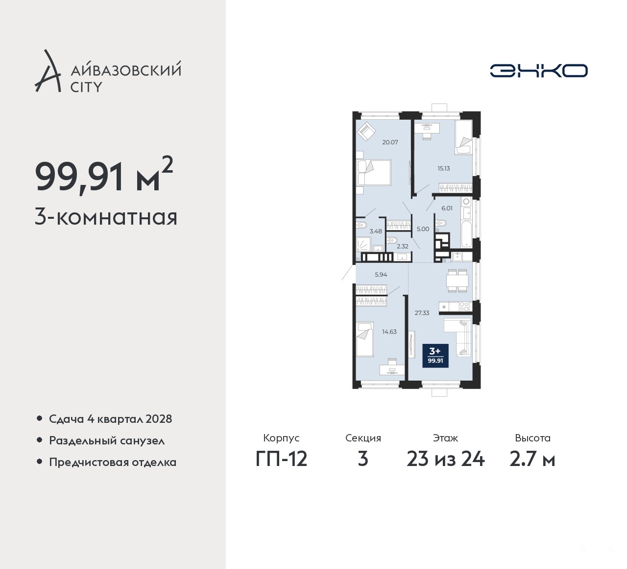 Трехкомнатная квартира от застройщика с предчистовой отделкой в ЖК "Айвазовский City" на 23 этаже. Общая площадь: 99.91 кв.м. Высота потолков 2.7 м.