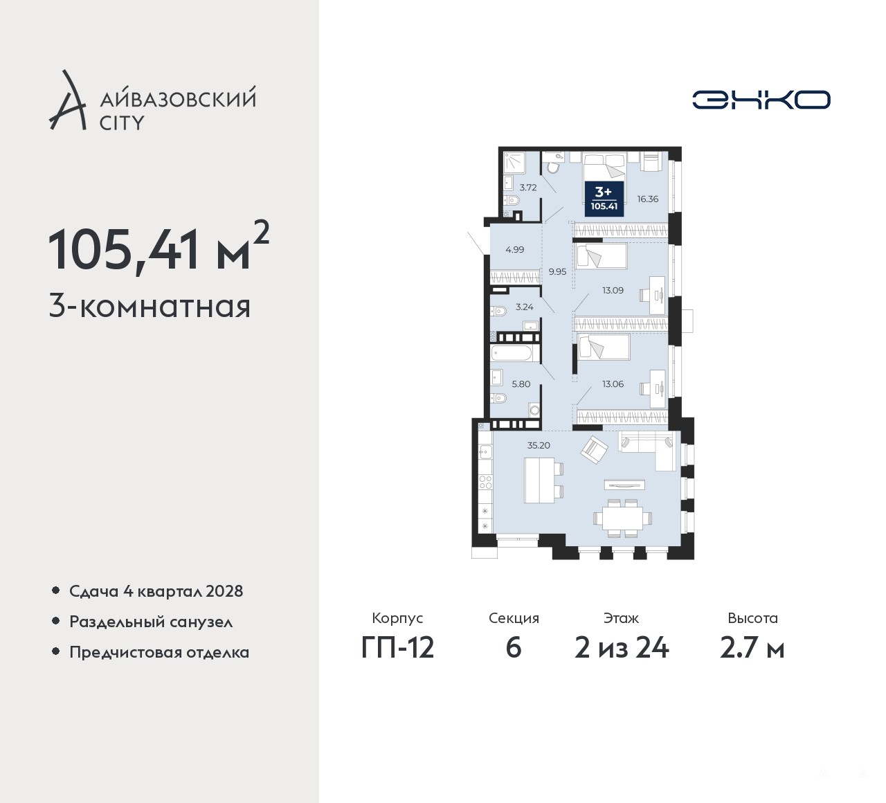 Продается 3-комн. квартира с предчистовой отделкой в ЖК "Айвазовский City" на 2 этаже. Общая площадь: 105.41 кв.м., жилая: 42.51 кв.м., площадь просторной кухни-столовой: 35.2 кв.м. Угловая квартира, идеально подойдет любителям тишины и панорамных видов. В квартире два совмещенных и один раздельный санузел. Высота потолков 2.7 м.