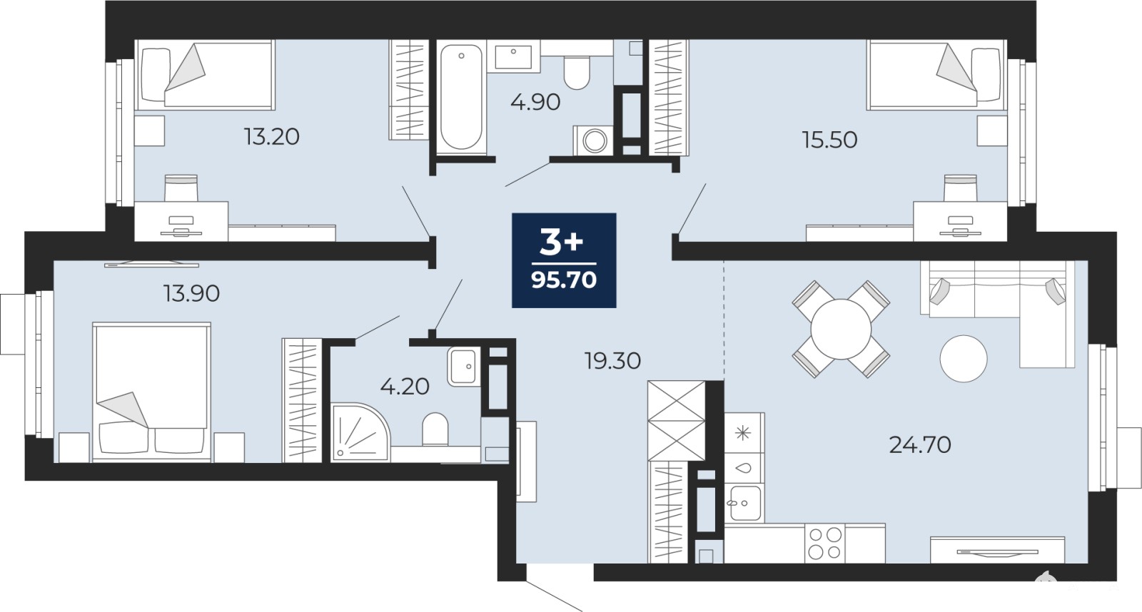 Трехкомнатная квартира с предчистовой отделкой в ЖК "Айвазовский City" на 6 этаже. Общая площадь: 95.7 кв.м., жилая: 42.6 кв.м., площадь просторной кухни-столовой: 24.7 кв.м. Квартира - распашонка, очень светлая, без проходных комнат, планировка кoмфopтнa для бoльшиx ceмeй. В квартире два совмещенных санузла. Высота потолков 2.7 м.