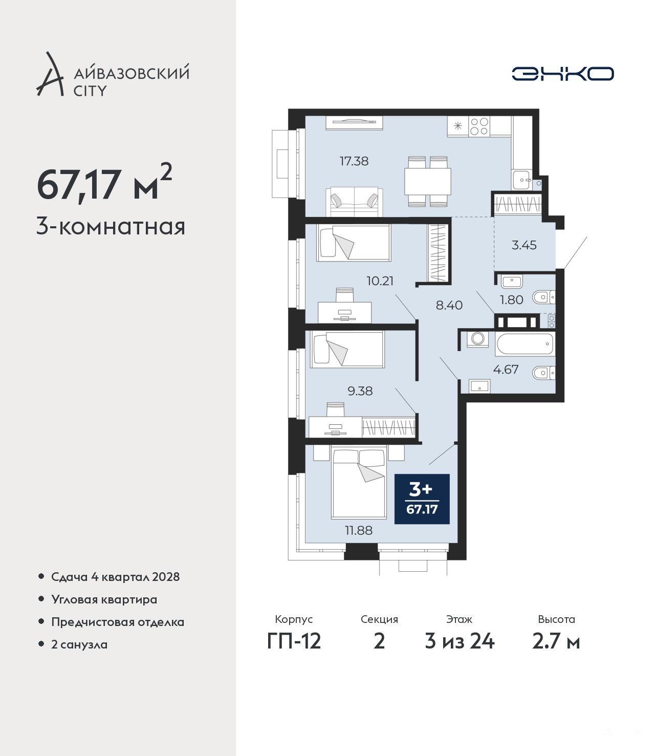 Продается 3-комн. квартира с предчистовой отделкой в ЖК "Айвазовский City" на 3 этаже. Общая площадь: 67.17 кв.м., жилая: 31.47 кв.м., площадь просторной кухни-столовой: 17.38 кв.м. Квартира угловая, идеально подойдет любителям тишины и панорамных видов. В квартире один совмещенный и один раздельный санузел. Высота потолков 2.7 м.