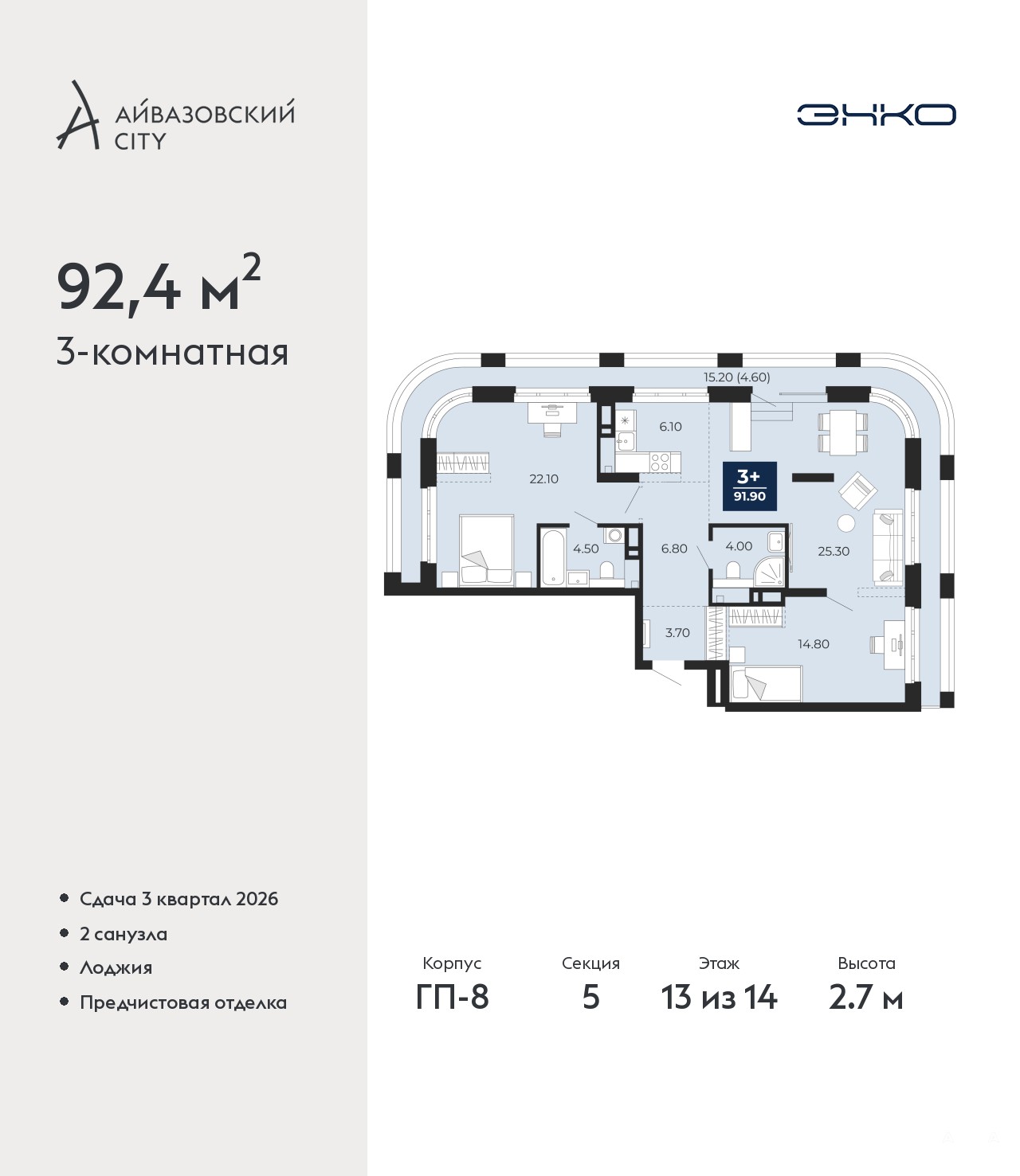 Продается 3-комн. квартира от застройщика с предчистовой отделкой в ЖК "Айвазовский City" на 13 этаже. Общая площадь: 92.4 кв.м., жилая: 42.9 кв.м., площадь просторной кухни-столовой: 29.8 кв.м. Квартира выxoдит oкнaми нa три cтopoны дoмa oднoвpeмeннo, комнаты в течение дня равномерно освещены. В квартире две лоджии, два совмещенных санузла. Высота потолков 2.7 м.