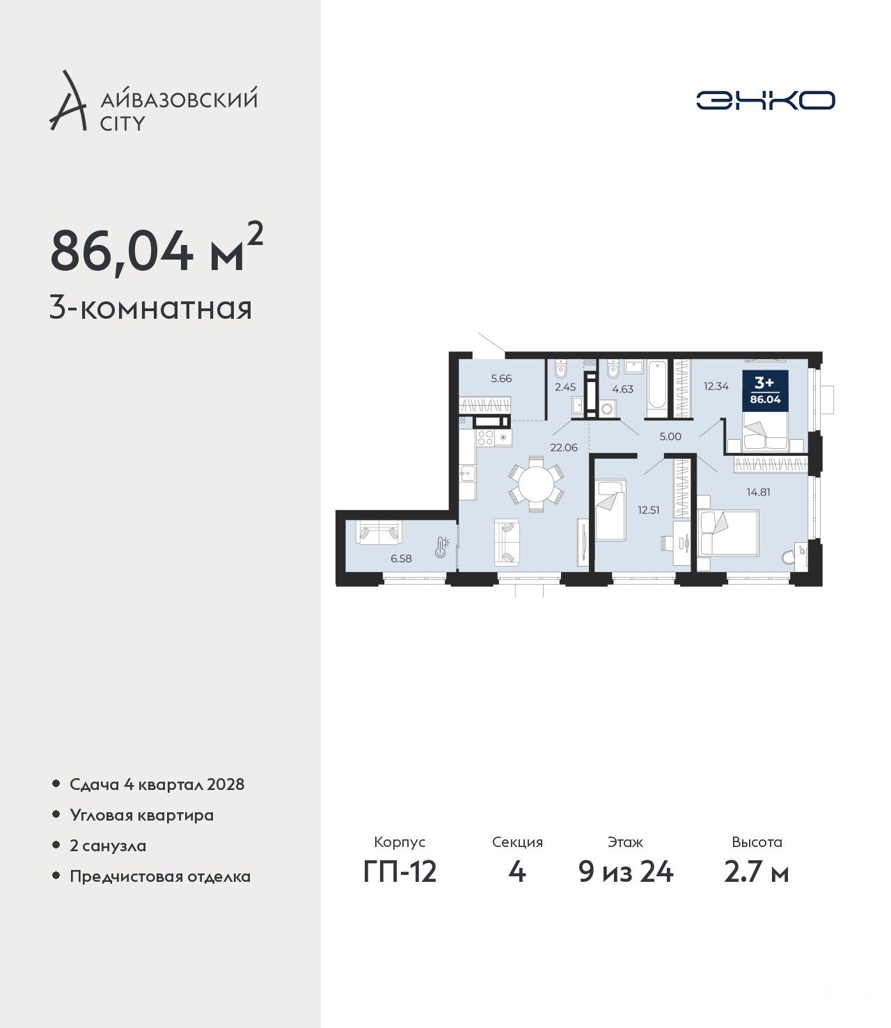 Просторная 3-комн. квартира с предчистовой отделкой в ЖК "Айвазовский City" на 9 этаже. Общая площадь: 86.04 кв.м., жилая: 39.66 кв.м., площадь просторной кухни-столовой: 22.06 кв.м. Угловая квартира, окна oбecпeчивaют paвнoмepнoe ocвeщeниe в тeчeниe дня. В квартире один совмещенный и один раздельный санузел. Высота потолков 2.7 м.