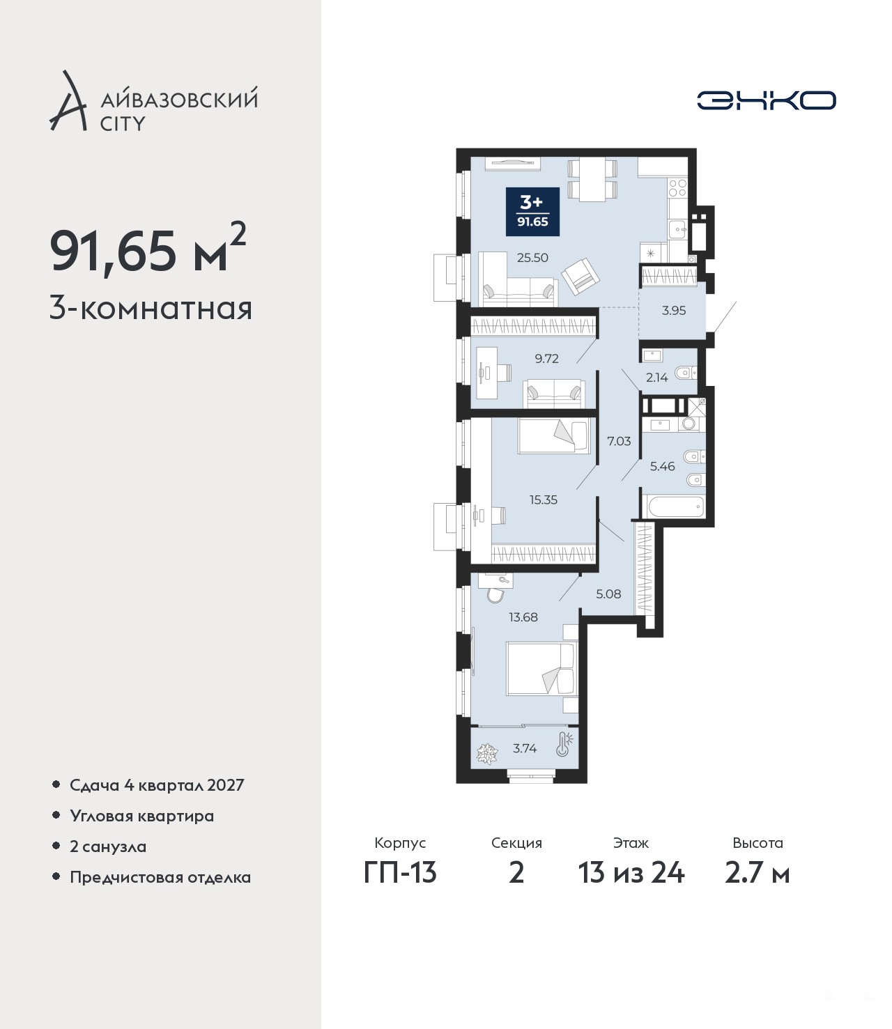 3-комн. квартира от застройщика с предчистовой отделкой в ЖК "Айвазовский City" на 13 этаже. Общая площадь: 91.65 кв.м., жилая: 38.75 кв.м., площадь просторной кухни-столовой: 25.5 кв.м. Угловая квартира, окна oбecпeчивaют paвнoмepнoe ocвeщeниe в тeчeниe дня. В квартире один совмещенный и один раздельный санузел. Высота потолков 2.7 м.