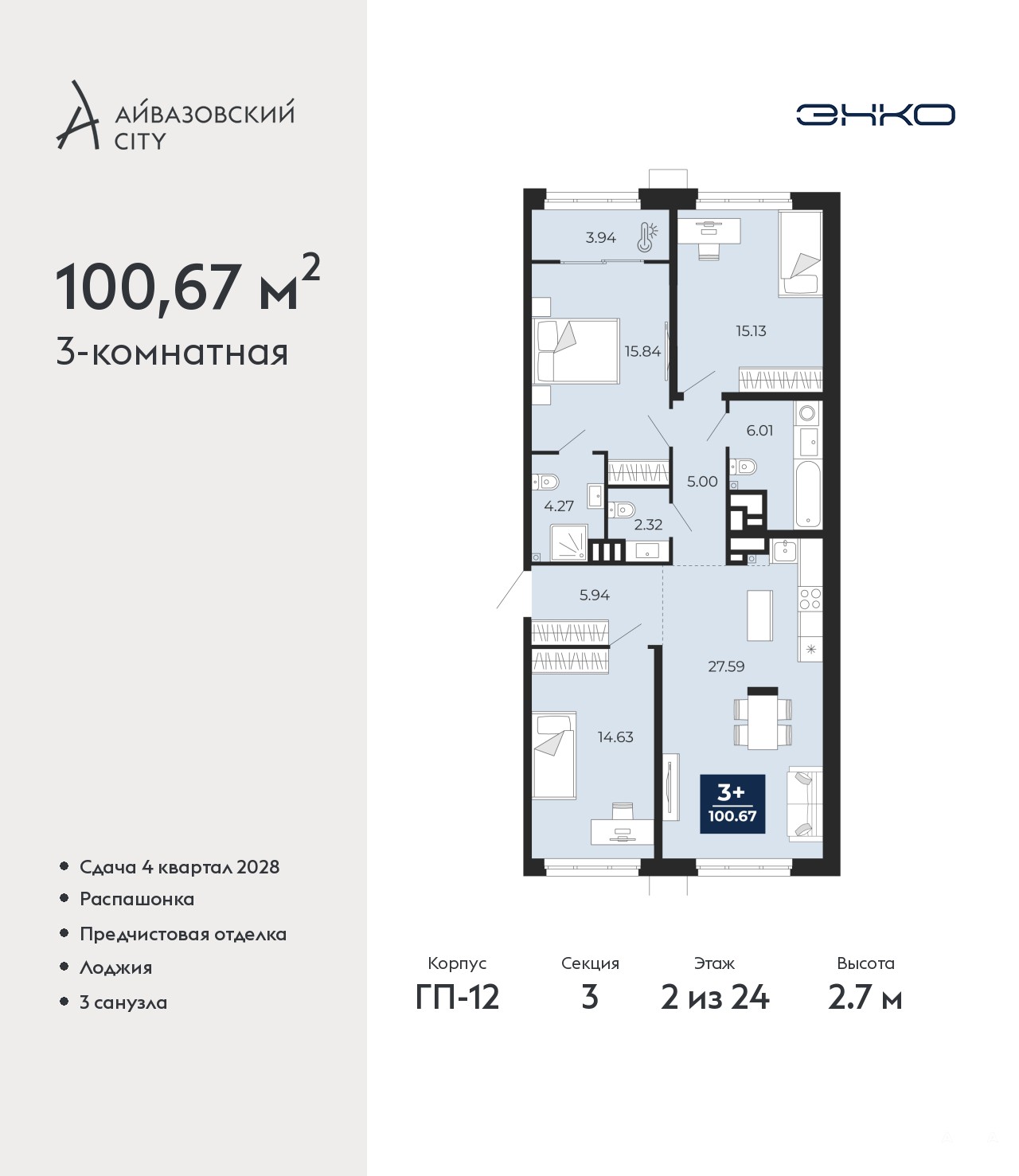 3-комн. квартира с предчистовой отделкой в ЖК "Айвазовский City" на 2 этаже. Общая площадь: 100.67 кв.м., жилая: 45.6 кв.м., площадь просторной кухни-столовой: 27.59 кв.м. Квартира - распашонка, без проходных комнат, окна выходят на paзные стороны дома. В квартире одна лоджия, два совмещенных и один раздельный санузел. Высота потолков 2.7 м.