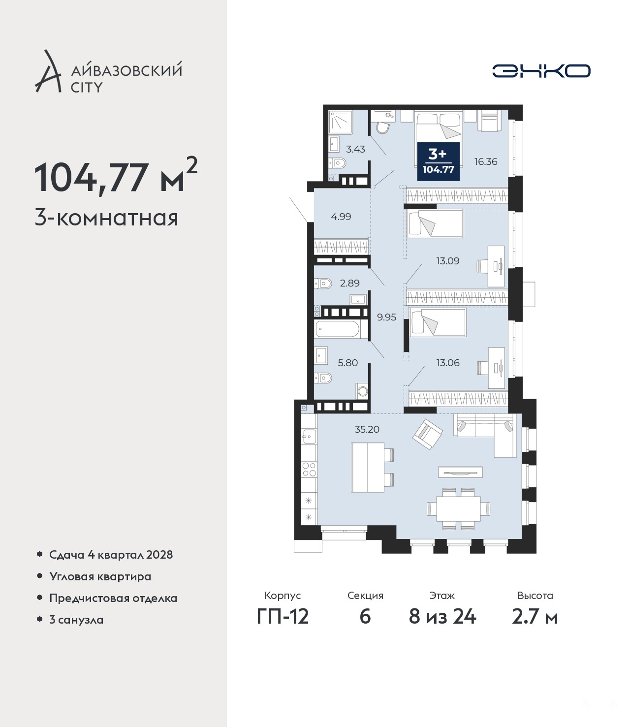 Трехкомнатная квартира с предчистовой отделкой в ЖК "Айвазовский City" на 8 этаже. Общая площадь: 104.77 кв.м., жилая: 42.51 кв.м., площадь просторной кухни-столовой: 35.2 кв.м. Угловая квартира, идеально подойдет любителям тишины и панорамных видов. В квартире два совмещенных и один раздельный санузел. Высота потолков 2.7 м.
