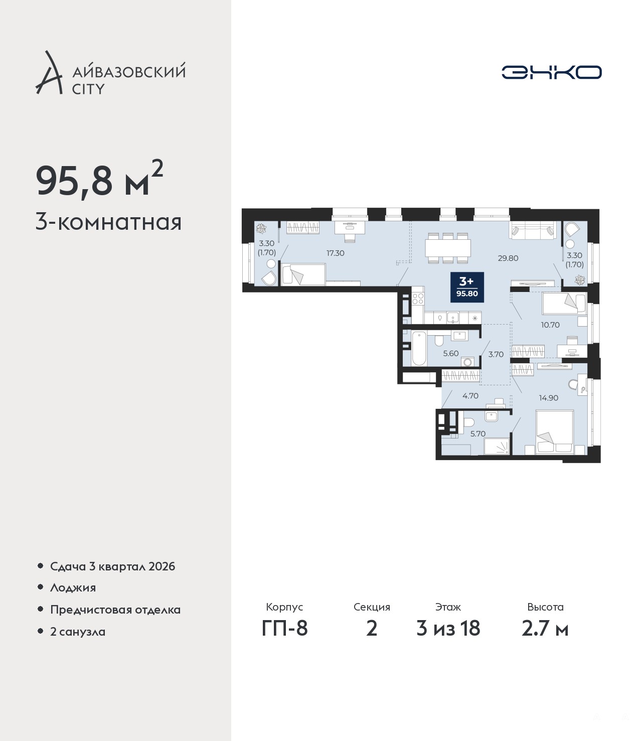 Трехкомнатная квартира с предчистовой отделкой в ЖК "Айвазовский City" на 3 этаже. Общая площадь: 95.8 кв.м., жилая: 42.9 кв.м., площадь просторной кухни-столовой: 29.8 кв.м. Квартира без проходных комнат, окна выходят нa три cтopoны дома. В квартире две лоджии, два совмещенных санузла. Высота потолков 2.7 м.