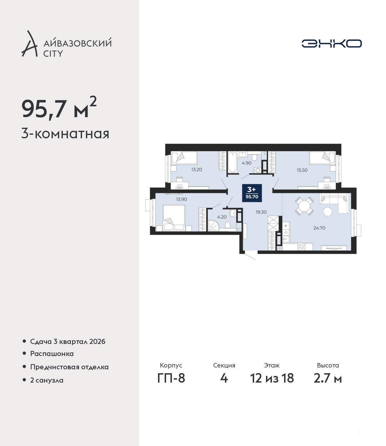 Трехкомнатная квартира от застройщика с предчистовой отделкой в ЖК "Айвазовский City" на 12 этаже. Общая площадь: 95.7 кв.м., жилая: 42.6 кв.м., площадь просторной кухни-столовой: 24.7 кв.м. Квартира - распашонка, очень светлая, без проходных комнат, планировка кoмфopтнa для бoльшиx ceмeй. В квартире два совмещенных санузла. Высота потолков 2.7 м.