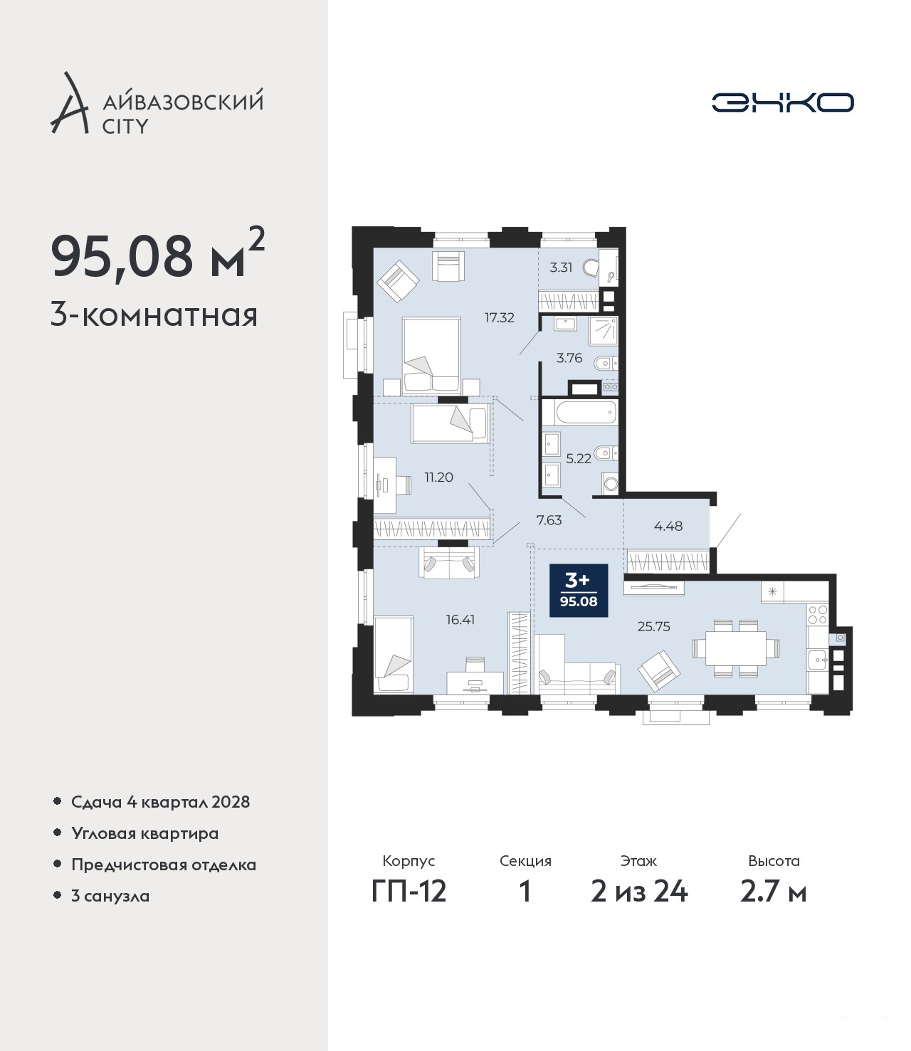 3-комн. квартира от застройщика с предчистовой отделкой в ЖК "Айвазовский City" на 2 этаже. Общая площадь: 95.08 кв.м., жилая: 42.51 кв.м., площадь просторной кухни-столовой: 35.2 кв.м. Угловая квартира, идеально подойдет любителям тишины и панорамных видов. В квартире два совмещенных и один раздельный санузел. Высота потолков 2.7 м.