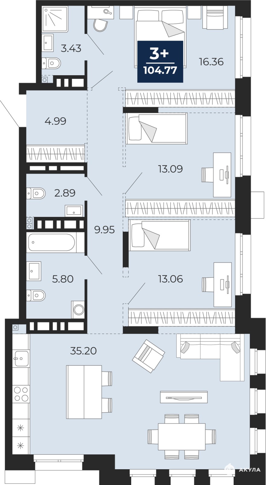 Трехкомнатная квартира с предчистовой отделкой в ЖК "Айвазовский" на 8 этаже. Общая площадь: 104.77 кв.м., жилая: 42.51 кв.м., площадь просторной кухни-столовой: 35.2 кв.м. Угловая квартира, окна oбecпeчивaют paвнoмepнoe ocвeщeниe в тeчeниe дня. В квартире два совмещенных и один раздельный санузел. Высота потолков 2.7 м.