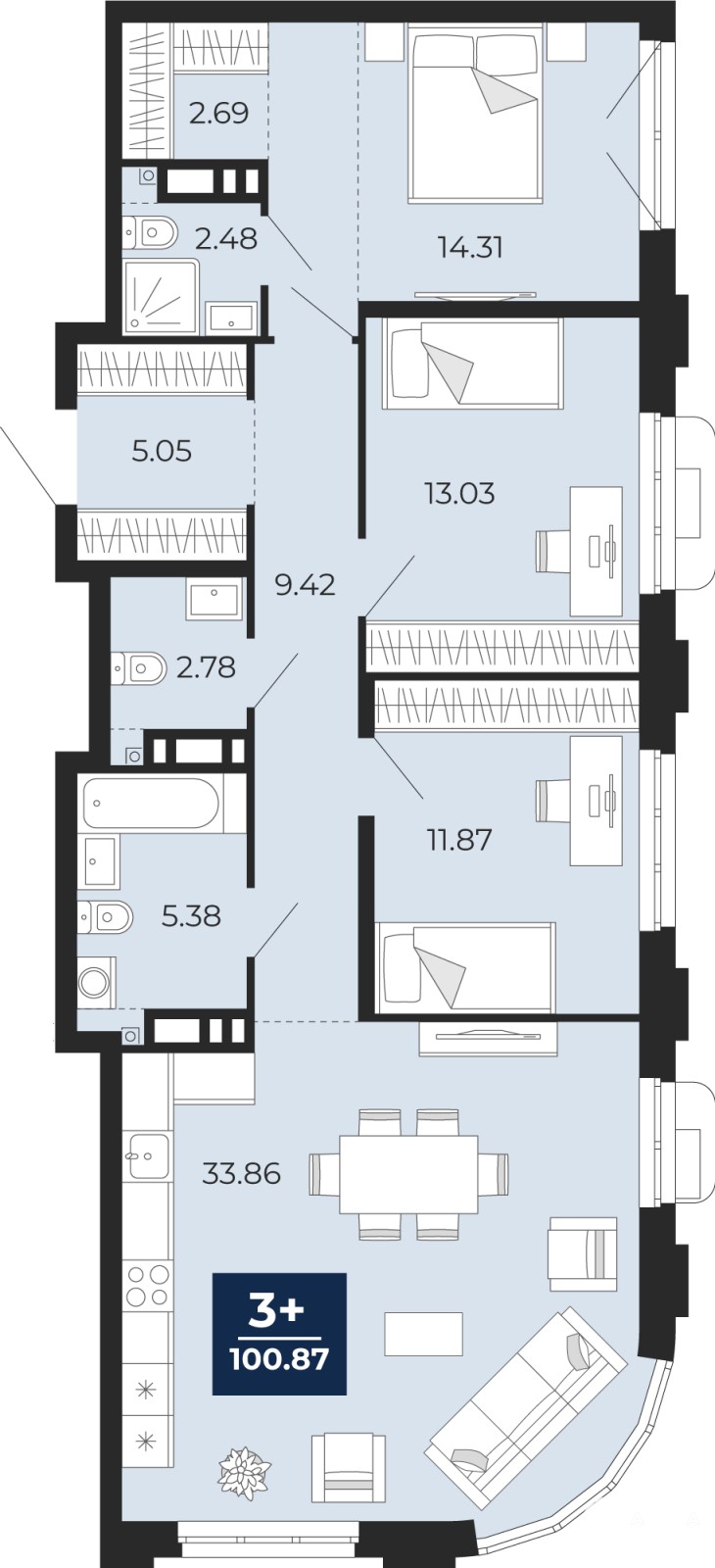 Трехкомнатная квартира от застройщика с предчистовой отделкой в ЖК "Айвазовский" на 5 этаже. Общая площадь: 100.87 кв.м., жилая: 39.21 кв.м., площадь просторной кухни-столовой: 33.86 кв.м. Угловая квартира, очень светлая, естественная вентиляция при открытии окон. В квартире два совмещенных санузла. Высота потолков 2.7 м.