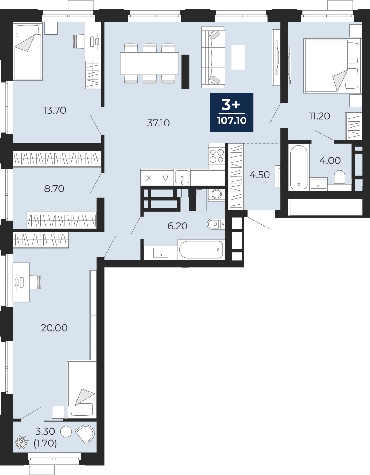 Просторная 3-комн. квартира с предчистовой отделкой в ЖК "Айвазовский" на 4 этаже. Общая площадь: 108.7 кв.м. Высота потолков 2.7 м.