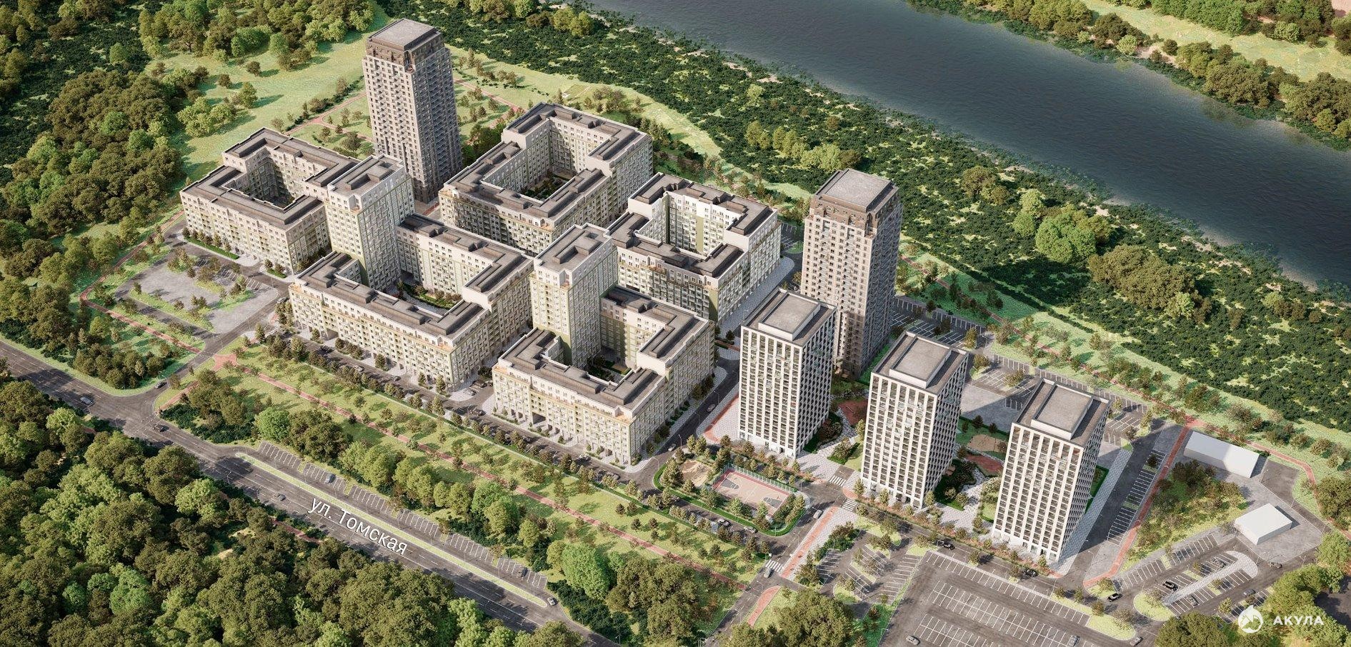 По мастер-плану здесь будет восемь домов. Ядро застройки составляют замкнутые кварталы переменной этажности. Их высотность понижается по мере приближения к реке. На углах участка мы разместили башни-доминанты.
