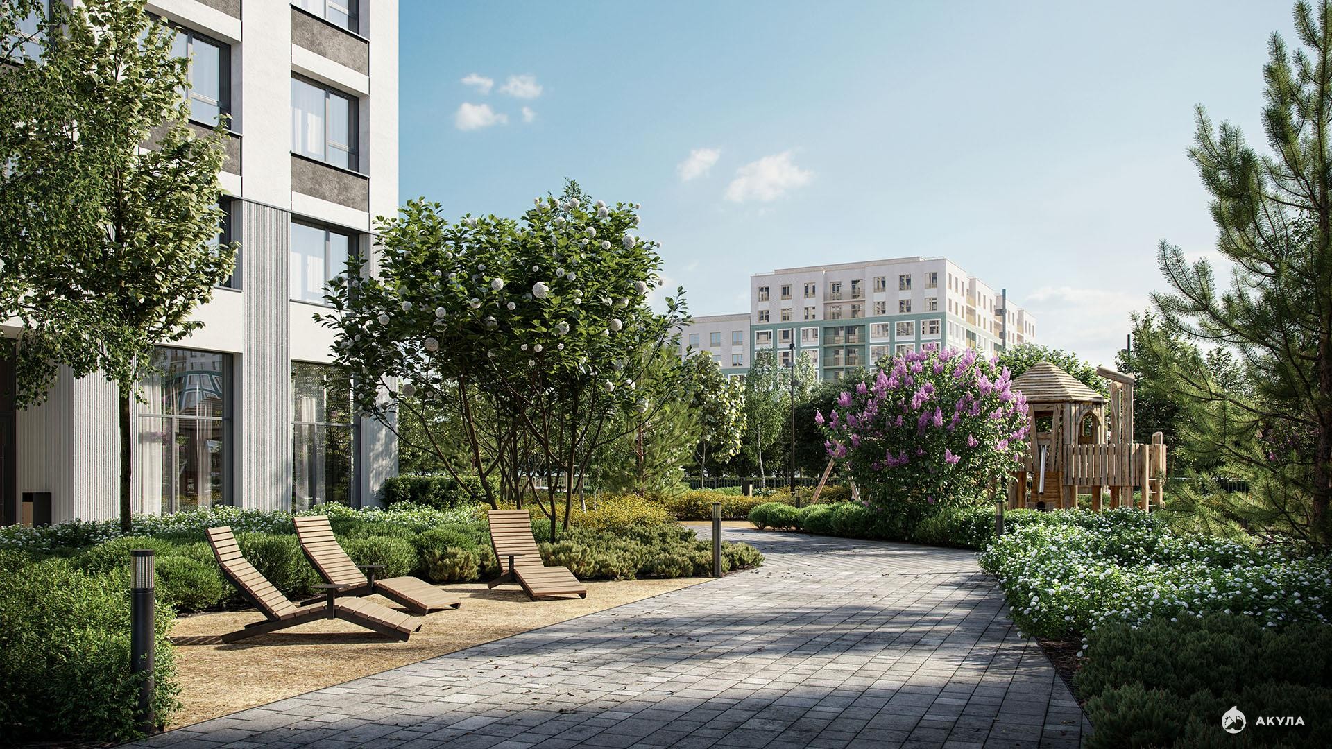 Смысловая ось квартала — широкая главная улица с высаженными вдоль неё высокими деревьями. Они создают тень и работают как шумо- и пылезащитные экраны. Это место сосредоточения основных пешеходных и транспортных потоков, на сторону которых мы ориентировали большинство коммерческих помещений. Отсюда жители могут свернуть на тихие соседские улицы и попасть на внутриквартальную площадь — ещё одну точку притяжения.