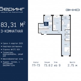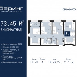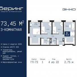 3-комн. квартира в ЖК "Беринг" на 4 этаже. Квартира без отделки, полностью готова к чистовой отделке и дальнейшему ремонту. Общая площадь: 73.45 кв.м., жилая: 34.76 кв.м., площадь просторной кухни-столовой: 19.04 кв.м. Угловая квартира, идеально подойдет любителям тишины и панорамных...