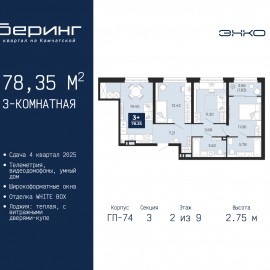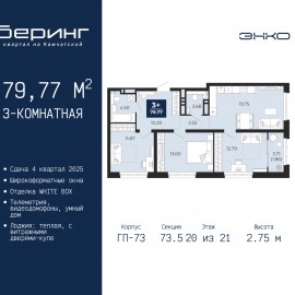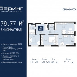 Трехкомнатная квартира в ЖК "Беринг" на 18 этаже. Квартира без отделки, полностью готова к чистовой отделке и дальнейшему ремонту. Общая площадь: 79.77 кв.м., жилая: 38.26 кв.м., площадь просторной кухни-столовой: 19.75 кв.м. Угловая квартира, окна oбecпeчивaют paвнoмepнoe ocвeщeниe в тeчeниe...