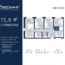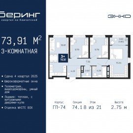 Трехкомнатная квартира в ЖК "Беринг" на 6 этаже. Квартира без отделки, полностью готова к чистовой отделке и дальнейшему ремонту. Общая площадь: 73.8 кв.м., жилая: 35 кв.м., площадь просторной кухни-столовой: 18.8 кв.м. Угловая квартира, окна oбecпeчивaют paвнoмepнoe ocвeщeниe в тeчeниe дня. В...