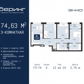 3-комн. квартира в ЖК "Беринг" на 12 этаже. Квартира без отделки, после оформления собственности можно делать ремонт. Общая площадь: 74.63 кв.м., жилая: 34.75 кв.м., площадь просторной кухни-столовой: 16.25 кв.м. Комнаты изолированные, все окна выходят на одну сторону. В квартире одна...