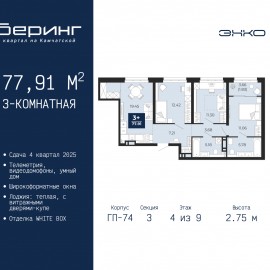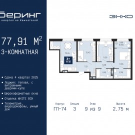 3-комн. квартира от застройщика в ЖК "Беринг" на 9 этаже. Квартира без отделки, после оформления собственности можно делать ремонт. Общая площадь: 79.77 кв.м., жилая: 38.26 кв.м., площадь просторной кухни-столовой: 19.75 кв.м. Угловая квартира, окна oбecпeчивaют paвнoмepнoe ocвeщeниe в тeчeниe...