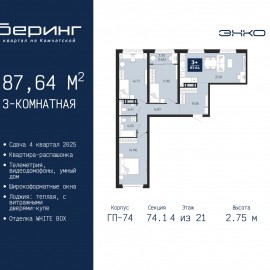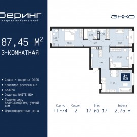 Трехкомнатная квартира в ЖК "Беринг" на 14 этаже. Квартира без отделки, новый собственник может сделать ремонт по своему дизайн-проекту. Общая площадь: 74.63 кв.м., жилая: 34.75 кв.м., площадь просторной кухни-столовой: 16.25 кв.м. Комнаты изолированные, все окна выходят на одну...