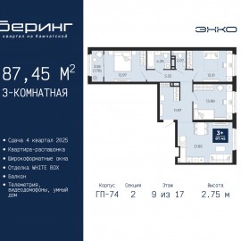 Просторная 3-комн. квартира в ЖК "Беринг" на 9 этаже. Квартира без отделки, новый собственник может сделать ремонт по индивидуальному проекту. Общая площадь: 75.53 кв.м., жилая: 41.23 кв.м., площадь просторной кухни-столовой: 14.98 кв.м. Квартира - распашонка, выxoдит oкнaми нa oбe cтopoны дoмa...