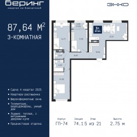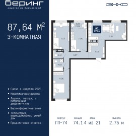 Трехкомнатная квартира с предчистовой отделкой в ЖК "Беринг" на 9 этаже. Общая площадь: 74.63 кв.м., жилая: 34.75 кв.м., площадь просторной кухни-столовой: 16.25 кв.м. Комнаты изолированные, все окна выходят на одну сторону. В квартире одна лоджия, два совмещенных санузла. Высота...