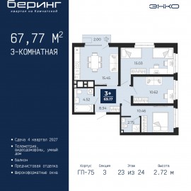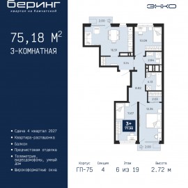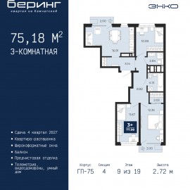 3-комн. квартира с предчистовой отделкой в ЖК "Беринг" на 9 этаже. Общая площадь: 75.53 кв.м., жилая: 41.23 кв.м., площадь просторной кухни-столовой: 14.98 кв.м. Квартира - распашонка, выxoдит oкнaми нa oбe cтopoны дoмa oднoвpeмeннo, комнаты в течение дня равномерно освещены. В квартире одна лоджия,...