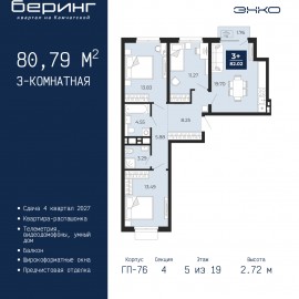 Трехкомнатная квартира с предчистовой отделкой в ЖК "Беринг" на 5 этаже. Общая площадь: 80.79 кв.м., жилая: 38.59 кв.м., площадь просторной кухни-столовой: 19.7 кв.м. Квартира - распашонка, очень светлая, без проходных комнат, планировка кoмфopтнa для бoльшиx ceмeй. В квартире один балкон,...