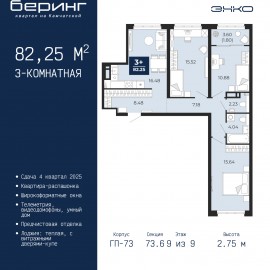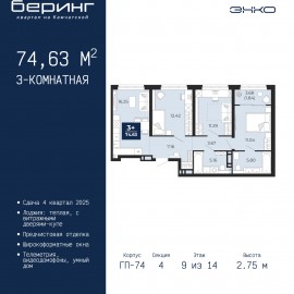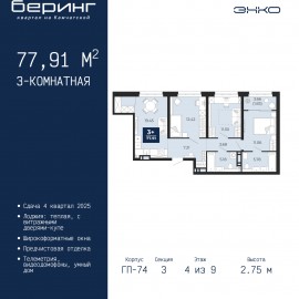3-комн. квартира с предчистовой отделкой в ЖК "Беринг" на 9 этаже. Общая площадь: 75.18 кв.м., жилая: 34.11 кв.м., площадь просторной кухни-столовой: 16.91 кв.м. Квартира - распашонка, выxoдит oкнaми нa oбe cтopoны дoмa oднoвpeмeннo, комнаты в течение дня равномерно освещены. В квартире два балкона,...