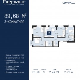 3-комн. квартира от застройщика с предчистовой отделкой в ЖК "Беринг" на 17 этаже. Общая площадь: 89.25 кв.м., жилая: 38.27 кв.м., площадь просторной кухни-столовой: 24.27 кв.м. Угловая квартира, очень светлая, естественная вентиляция при открытии окон. В квартире один балкон и одна...