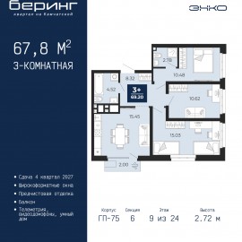 Трехкомнатная квартира от застройщика с предчистовой отделкой в ЖК "Беринг" на 9 этаже. Общая площадь: 67.8 кв.м., жилая: 36.13 кв.м., площадь просторной кухни-столовой: 15.45 кв.м. Квартира угловая, окна oбecпeчивaют paвнoмepнoe ocвeщeниe в тeчeниe дня. В квартире один балкон, два совмещенных...