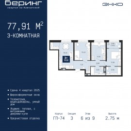 Трехкомнатная квартира с предчистовой отделкой в ЖК "Беринг" на 6 этаже. Общая площадь: 77.91 кв.м., жилая: 34.78 кв.м., площадь просторной кухни-столовой: 19.45 кв.м. Комнаты изолированные, все окна выходят на одну сторону. В квартире одна лоджия, два совмещенных санузла. Высота...