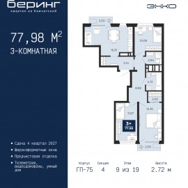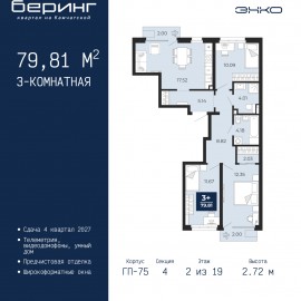 3-комн. квартира с предчистовой отделкой в ЖК "Беринг" на 2 этаже. Общая площадь: 79.81 кв.м. Высота потолков 2.72 м. Дом монолитный, многоподъездный, переменной этажности, от 17 до 24 этажей. Квартира находится в 4-й секции высотой 19 этажей в корпусе ГП-75. На этаже 4 квартиры. В...