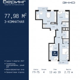 Трехкомнатная квартира от застройщика с предчистовой отделкой в ЖК "Беринг" на 13 этаже. Общая площадь: 77.98 кв.м., жилая: 34.11 кв.м., площадь просторной кухни-столовой: 16.91 кв.м. Квартира - распашонка, без проходных комнат, окна выходят на paзные стороны дома. В квартире два балкона,...