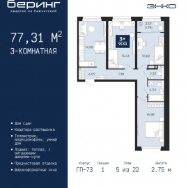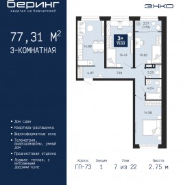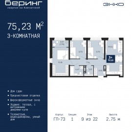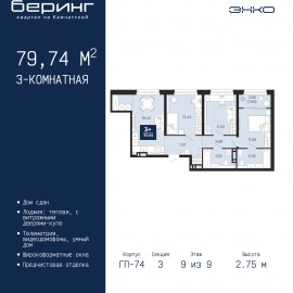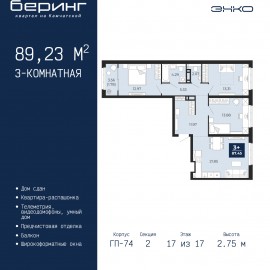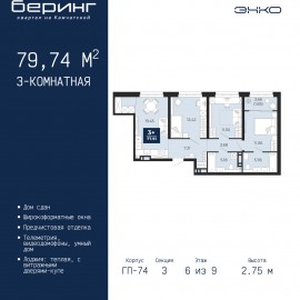 Торопитесь забронировать по акционной цене, период предложения ограничен! Стоимость квартиры указана со скидкой, ваша экономия составит 981, 295 руб. Звоните, мы вам все подробно расскажем. 3-комн. квартира с предчистовой отделкой в ЖК "Беринг" на 9 этаже. Общая площадь: 75.23...
