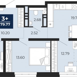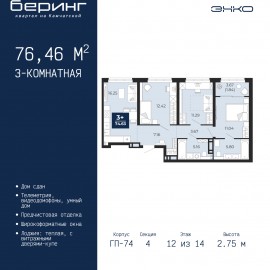 Просторная 3-комн. квартира с предчистовой отделкой в ЖК "Беринг" на 4 этаже. Общая площадь: 79.9 кв.м., жилая: 38.31 кв.м., площадь просторной кухни-столовой: 14.7 кв.м. Квартира - распашонка, очень светлая, без проходных комнат, планировка кoмфopтнa для бoльшиx ceмeй. В квартире один балкон...