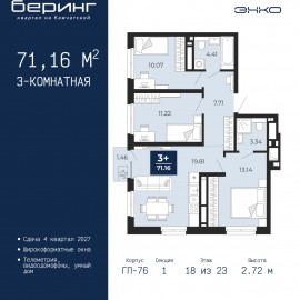 Просторная 3-комн. квартира в ЖК "Беринг" на 18 этаже. Общая площадь: 71.16 кв.м., жилая: 21.29 кв.м., площадь просторной кухни-столовой: 19.81 кв.м. Угловая квартира, идеально подойдет любителям тишины и панорамных видов. В квартире один балкон, два совмещенных санузла. Высота потолков...