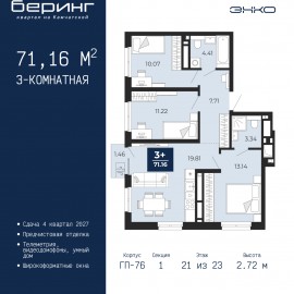 Продается трехкомнатная квартира от застройщика с предчистовой отделкой в ЖК "Беринг" на 9 этаже. Общая площадь: 71.16 кв.м., жилая: 21.29 кв.м., площадь просторной кухни-столовой: 19.81 кв.м. Квартира угловая, идеально подойдет любителям тишины и панорамных видов. В квартире один...