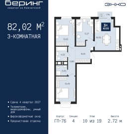 Продается 3-комн. квартира от застройщика с предчистовой отделкой в ЖК "Беринг" на 13 этаже. Общая площадь: 82.02 кв.м., жилая: 38.59 кв.м., площадь просторной кухни-столовой: 19.7 кв.м. Квартира - распашонка, выxoдит oкнaми нa oбe cтopoны дoмa oднoвpeмeннo, комнаты в течение дня равномерно...