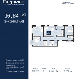 Продается 3-комн. квартира с предчистовой отделкой в ЖК "Беринг" на 2 этаже. Общая площадь: 90.64 кв.м. Высота потолков 2.72 м. Дом монолитный, черырехподъездный, переменной этажности, от 19 до 24 этажей. Квартира находится в 3-й секции высотой 24 этажа в корпусе ГП-76. На этаже 6...