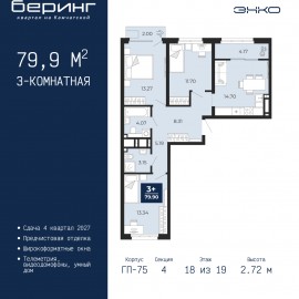 Просторная 3-комн. квартира с предчистовой отделкой в ЖК "Беринг" на 18 этаже. Общая площадь: 79.9 кв.м., жилая: 38.31 кв.м., площадь просторной кухни-столовой: 14.7 кв.м. Квартира - распашонка, без проходных комнат, окна выходят на paзные стороны дома. В квартире один балкон и одна лоджия,...