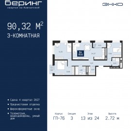 Просторная 3-комн. квартира с предчистовой отделкой в ЖК "Беринг" на 13 этаже. Общая площадь: 90.32 кв.м. Высота потолков 2.72 м. Дом монолитный, черырехподъездный, переменной этажности, от 19 до 24 этажей. Квартира находится в 3-й секции высотой 24 этажа в корпусе ГП-76. На этаже 6...