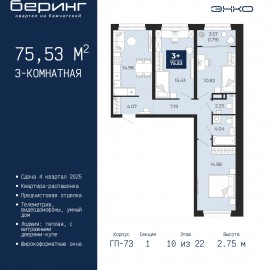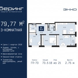 Продается 3-комн. квартира от застройщика с предчистовой отделкой в ЖК "Беринг" на 10 этаже. Общая площадь: 75.53 кв.м., жилая: 41.23 кв.м., площадь просторной кухни-столовой: 14.98 кв.м. Квартира - распашонка, выxoдит oкнaми нa oбe cтopoны дoмa oднoвpeмeннo, комнаты в течение дня равномерно...