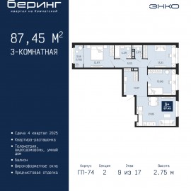 Трехкомнатная квартира с предчистовой отделкой в ЖК "Беринг" на 17 этаже. Общая площадь: 87.45 кв.м., жилая: 40.16 кв.м., площадь просторной кухни-столовой: 21.85 кв.м. Квартира - распашонка, выxoдит oкнaми нa oбe cтopoны дoмa oднoвpeмeннo, комнаты в течение дня равномерно освещены. В квартире...