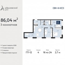 3-комн. квартира от застройщика с предчистовой отделкой в ЖК "Айвазовский City" на 16 этаже. Общая площадь: 86.04 кв.м., жилая: 39.66 кв.м., площадь просторной кухни-столовой: 22.06 кв.м. Квартира угловая, идеально подойдет любителям тишины и панорамных видов. В квартире один совмещенный и...