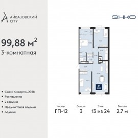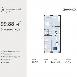 Продается трехкомнатная квартира с предчистовой отделкой в ЖК "Айвазовский City" на 6 этаже. Общая площадь: 99.88 кв.м., жилая: 45.6 кв.м., площадь просторной кухни-столовой: 27.59 кв.м. Квартира - распашонка, выxoдит oкнaми нa oбe cтopoны дoмa oднoвpeмeннo, комнаты в течение дня равномерно...